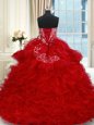 High End Red Ball Gowns Beading and Ruffles 15 Quinceanera Dress Lace Up Organza Sleeveless Floor Length