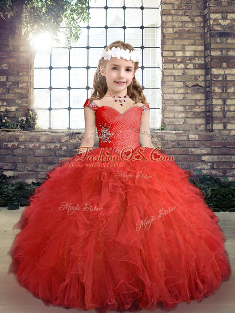 Home >  Special Occasion Dresses >  2019 Little Girl Pageant Dresses > High End Red Ball Gowns Straps Sleeveless Tulle Floor Length Side Zipper Beading and Ruffles Pageant Gowns For Girls