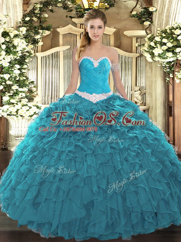 Home >  Quinceanera Dresses >  Fast Delivery Quinceanera Dresses > High End Teal Sweetheart Lace Up Appliques and Ruffles Quinceanera Gown Sleeveless