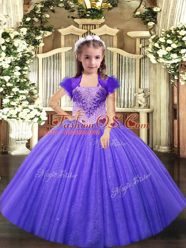 High End Tulle Straps Sleeveless Lace Up Beading Little Girls Pageant Gowns in Lavender