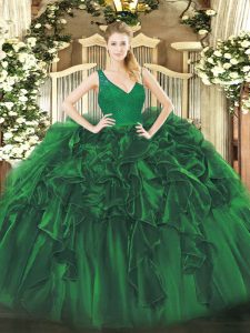 High End V-neck Sleeveless Quinceanera Gowns Floor Length Beading and Ruffles Dark Green Organza
