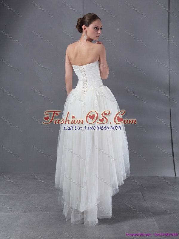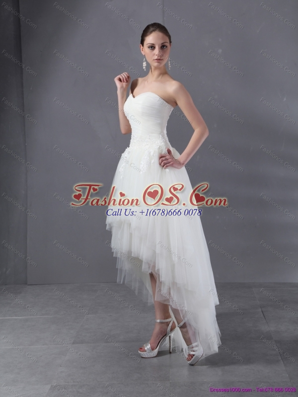 High Low White Sweetheart Wedding Dresses with Ruching and Appliques