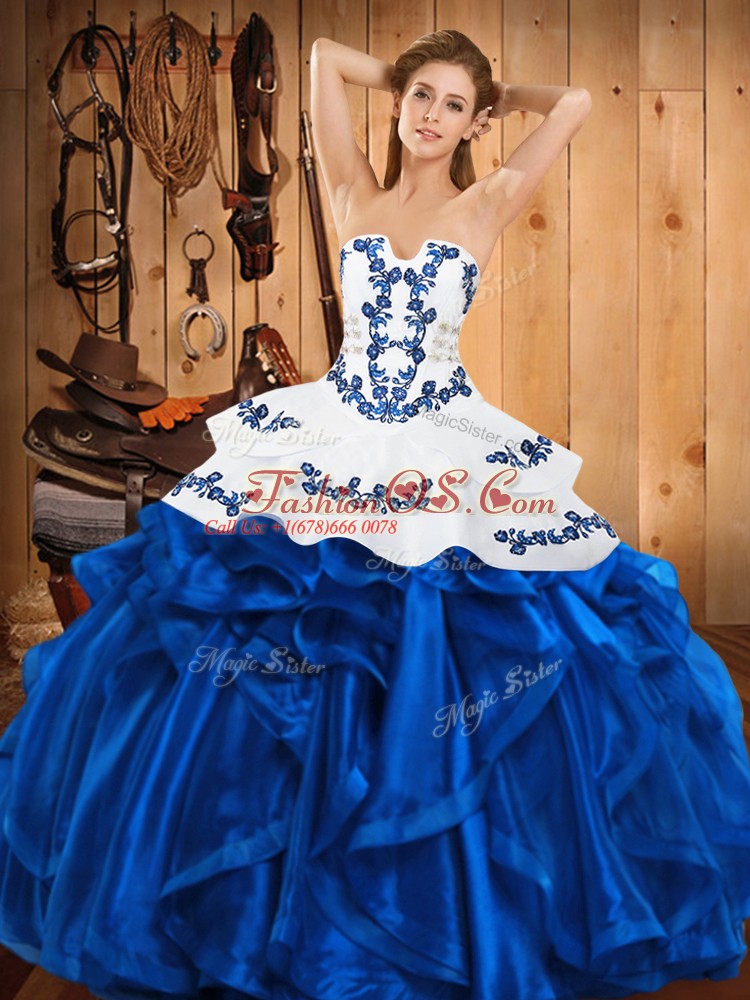 High Quality Blue Ball Gowns Strapless Sleeveless Satin and Organza Floor Length Lace Up Embroidery and Ruffles Sweet 16 Dress