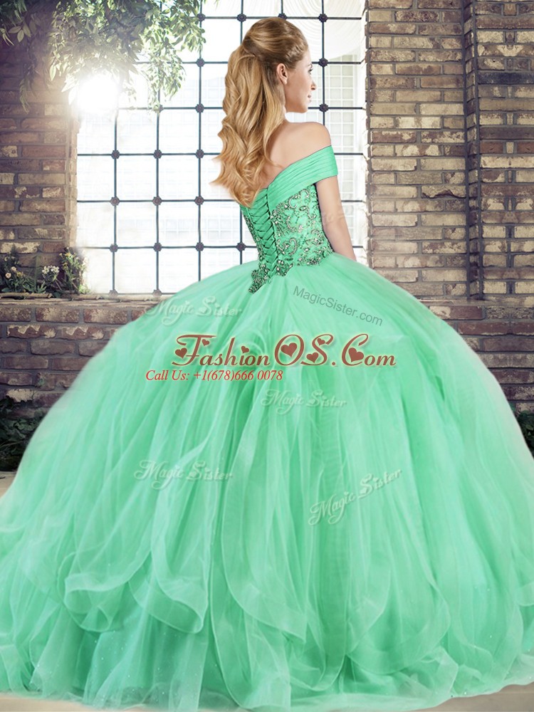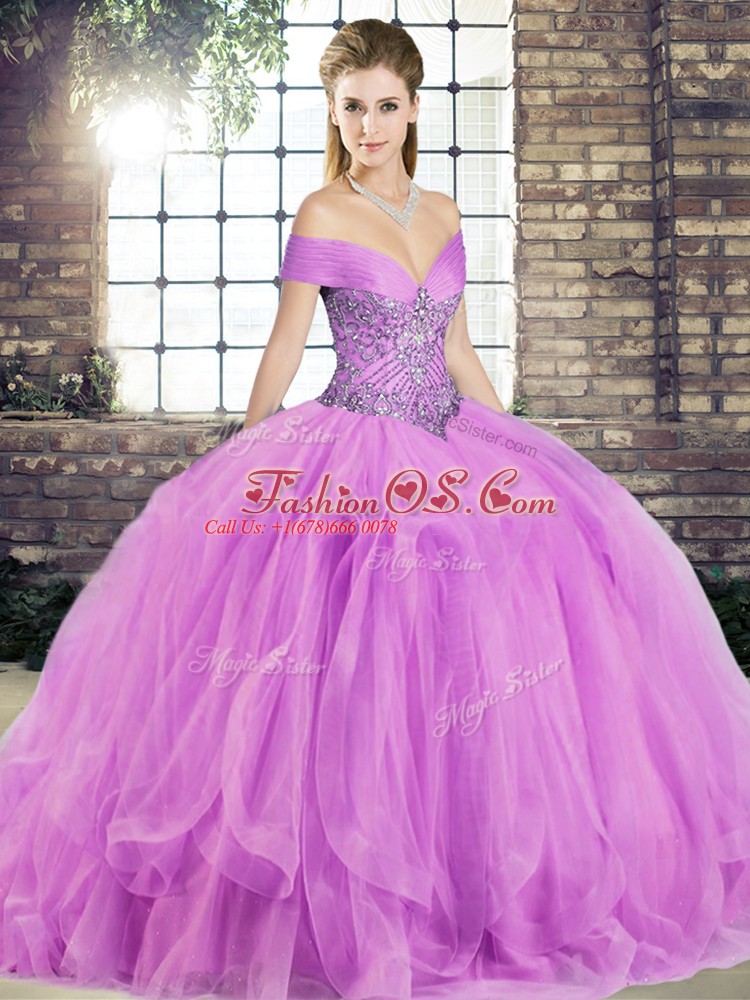 High Quality Floor Length Lilac 15th Birthday Dress Tulle Sleeveless Beading and Ruffles