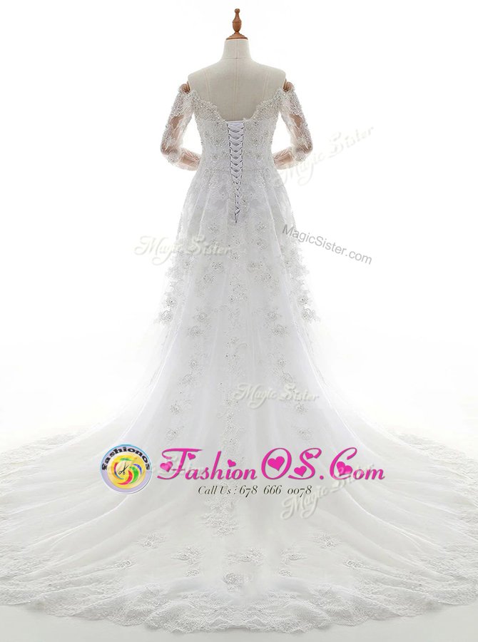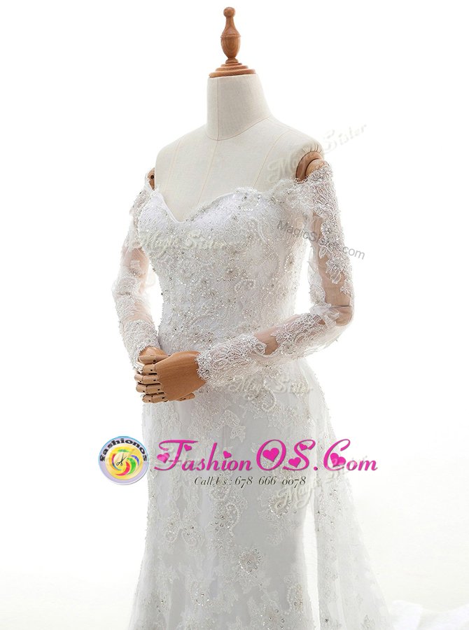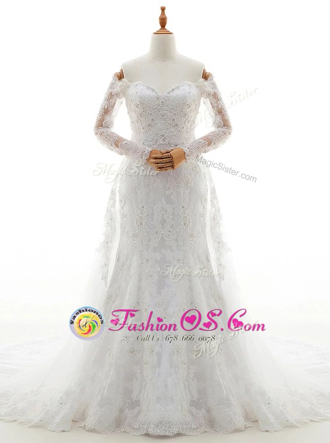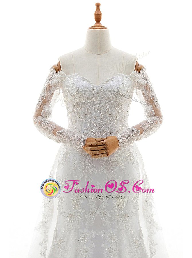 Silhouette: Column/Sheath Neckline: off the shoulder Sleeve Length: long sleeves Hemline/Train: with train Back Detail: lace up Embellishment: beading,lace Fabric: lace Shown Color: white(Color & Style representation may vary by monitor.) Occasion: wedding party Season: spring,summer,fall,winter Fully Lined: Yes Built-In Bra: Yes
