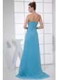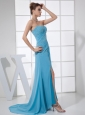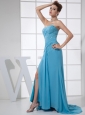 High Slit Beading Strapless Brush Train Blue Chiffon 2013 Prom Dress