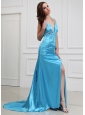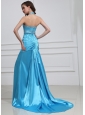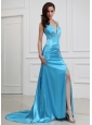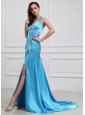Home >  Prom Dresses >  Popular Prom Dresses > High Slit Column Beading Halter Elastic Woven Satin Prom Dress Brush / Sweep Blue