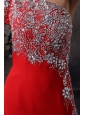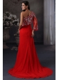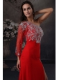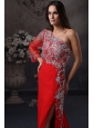 High Slit One Shoulder Red Prom Dress with Beading Long Sleeve