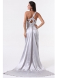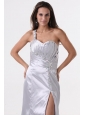 High Slit Silver One Shoulder Prom Dress with Ruching and Beading