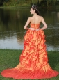 The thoroughly modern style of this strapless high-low dress is bound to brighten up your day! Its fits like a glove design is enhanced by a fitted bodice and the bust like a blooming lotus adds more interests to this dress. Dazzling decorative pattern like starfishs accents thoughout the waist. The chic ruched skirt is completed with a sweep train. The lace up back makes i perfectly fit. A great choice for any event on your calendar.