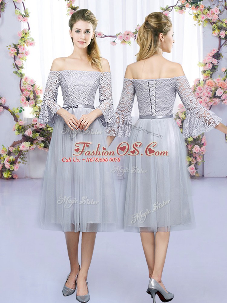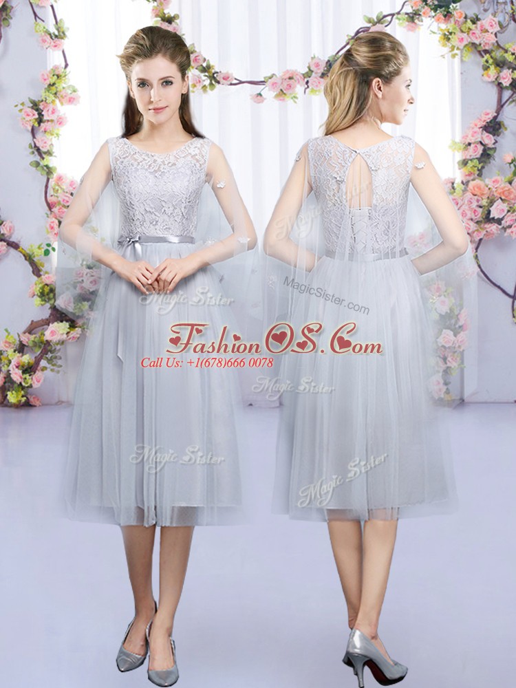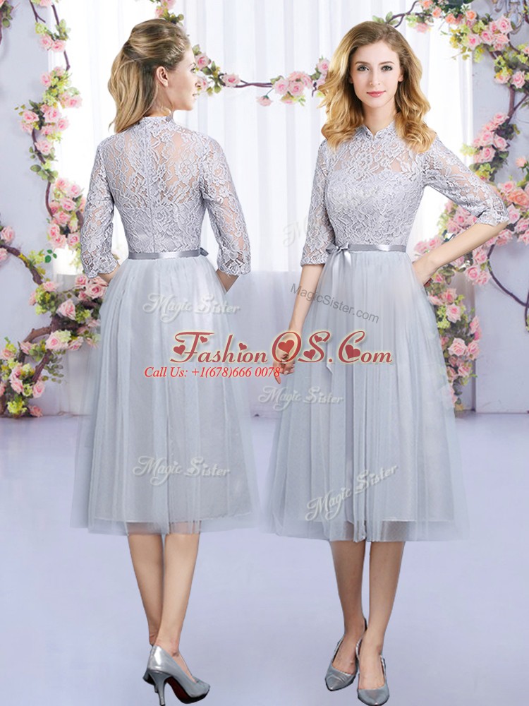 High-neck Half Sleeves Quinceanera Dama Dress Tea Length Lace and Belt Grey Tulle
