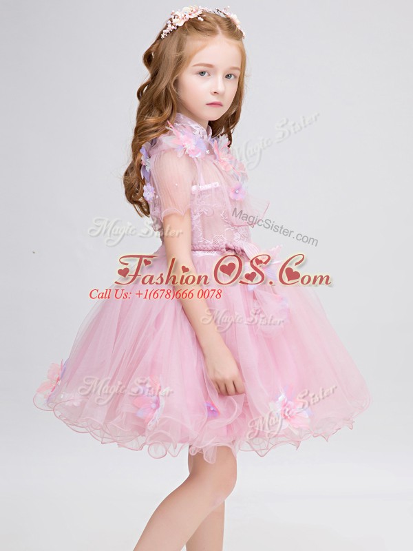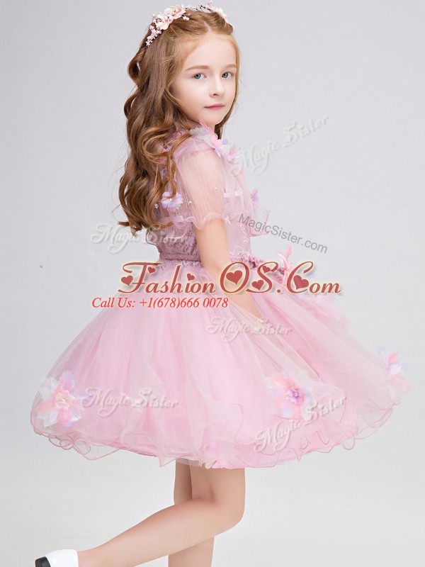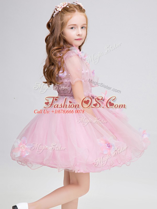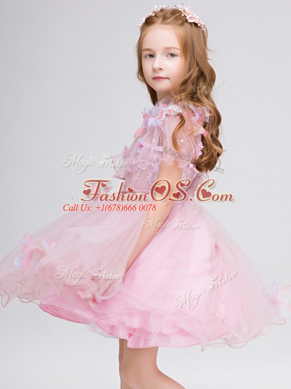 High-neck Short Sleeves Tulle Flower Girl Dresses for Less Appliques Zipper