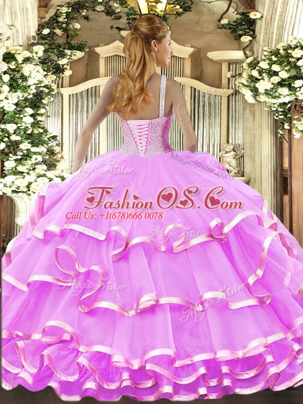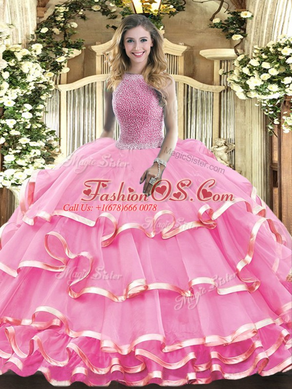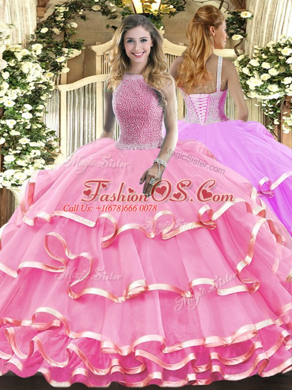 High-neck Sleeveless Lace Up Sweet 16 Dress Rose Pink Organza