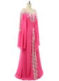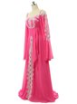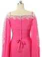Hot Pink A-line Chiffon Spaghetti Straps Long Sleeves Lace and Sequins Zipper Sweep Train