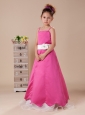 Sweet and lovely, this flower girl dress has a classic hot pink in it. Straight neckline with two spaghetti straps adds beauty to the whole design. The combination of satin and organza in two contrasting colors shows the energy of youth. The waist is slightly gathered by exquisite waistband with floral decoration. Hidden zipper back finishes the look.