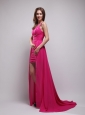 Hot Pink Asymmetrical One Shouleder Brush Train Chiffon Beading Prom / Evening Dress