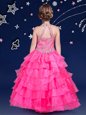 Hot Pink Ball Gowns Halter Top Sleeveless Organza Floor Length Zipper Beading and Ruffled Layers Little Girl Pageant Gowns