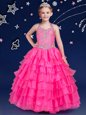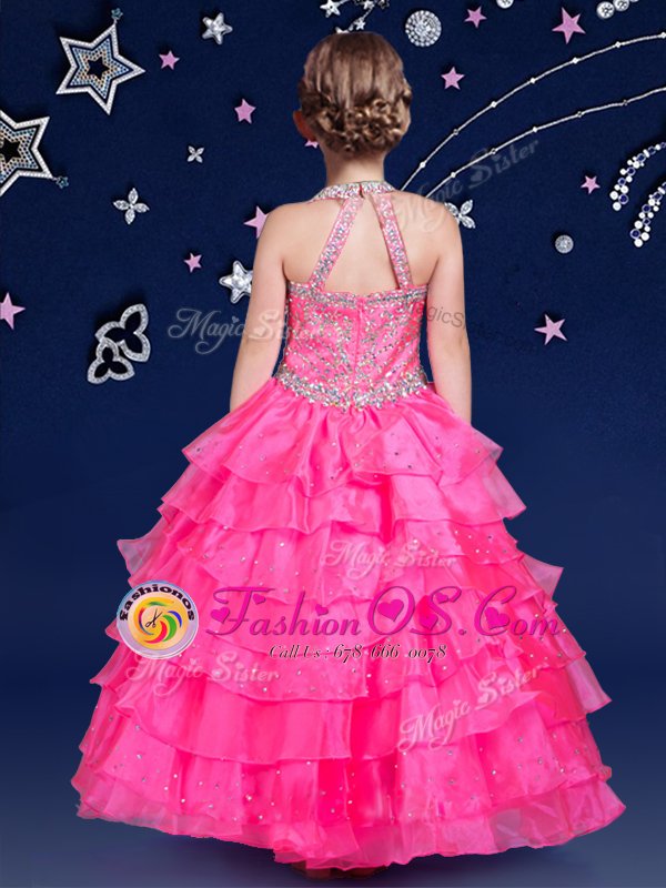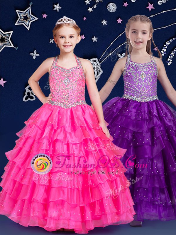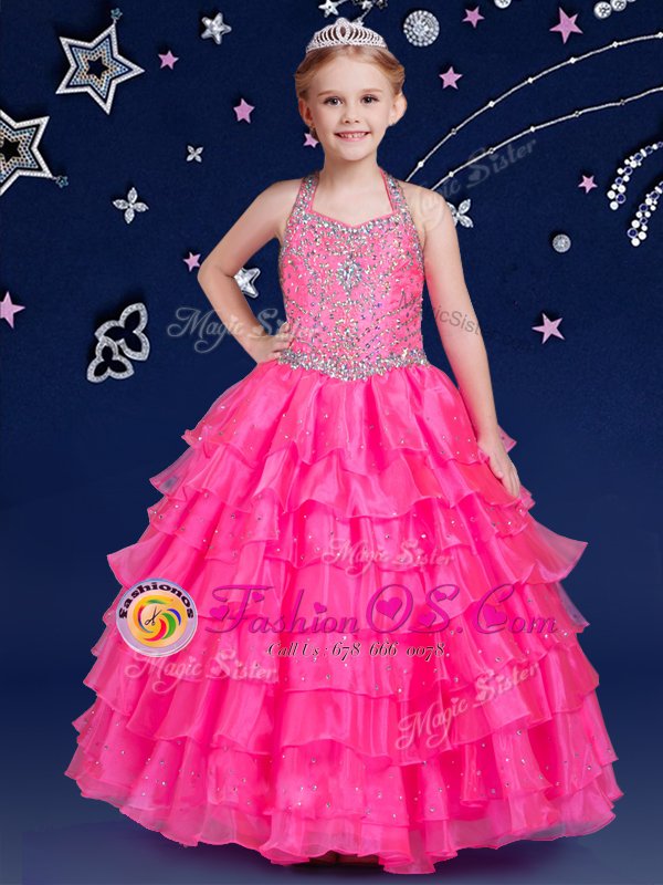 Home >  Special Occasion Dresses >  New Style Little Girl Pageant Dresses > Hot Pink Ball Gowns Halter Top Sleeveless Organza Floor Length Zipper Beading and Ruffled Layers Little Girl Pageant Gowns