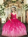 Hot Pink Ball Gowns Tulle V-neck Sleeveless Beading and Ruffles Floor Length Backless Pageant Gowns For Girls