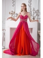 Add a romantic vibe to your 2012 prom or formal this sexy long dress may be the best choice for you. The spaghetti straps dress features a sweetheart neckline and ruched bodice. The beadings on the waistline will make you to be the shining star on your event day. The slit in the front may portray your long leg and better show this two layers dress.The chapel length train will make you more attractive.