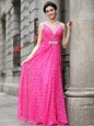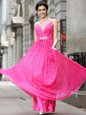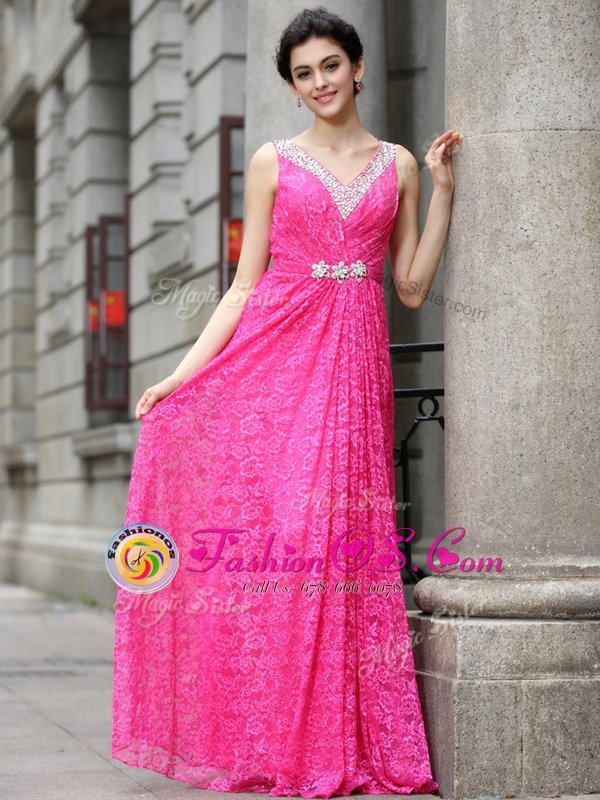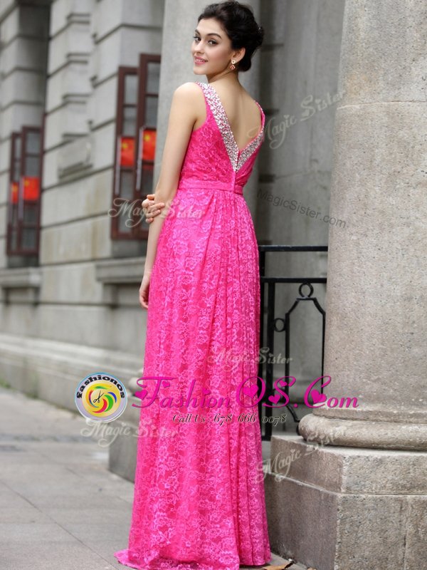 Hot Pink Column/Sheath Lace V-neck Sleeveless Beading and Lace Floor Length Zipper