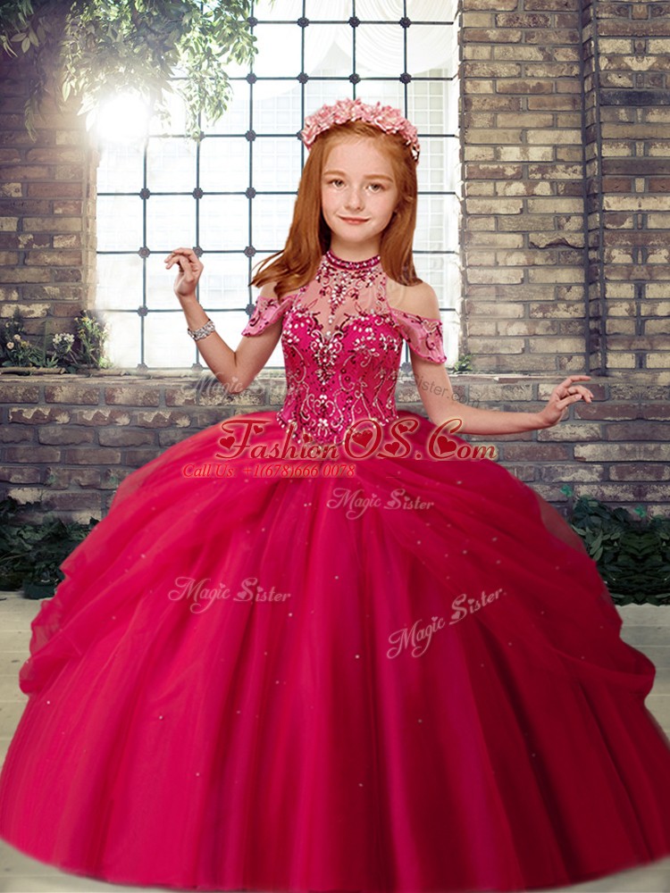 Home >  Special Occasion Dresses >  2018 Little Girl Pageant Dresses > Hot Pink Halter Top Lace Up Beading Kids Formal Wear Sleeveless