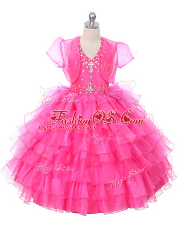 Home >  Special Occasion Dresses >  New Style Little Girl Pageant Dresses > Hot Pink Halter Top Neckline Beading and Ruffled Layers Pageant Gowns For Girls Sleeveless Lace Up