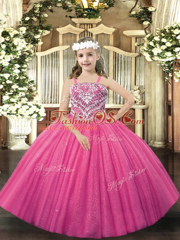 Hot Pink Straps Neckline Beading Kids Formal Wear Sleeveless Lace Up