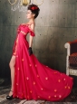 A winderful dress is full of elemants. Lovely but not snazzy! It features a classical sweetheart neckline and sexy off shoulder sleeves. The empire waistband lengthens your silhouette and the middle flower adds more chic and fun! The inner fabric possess a China national flavor while the outside chiffon fabric adorned with delicate flowers creats a high-low style!