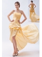 Lace is a nice design element that adds lots of charm and style to any design. This dress shows just how they do it. It is made from a nice chiffon fabric and features a pretty strapless bodice with a wrapped texture. The side of the bodice is embellished with several beautiful floral patterns that extend from the top to the waist of the dress. The skirt features an asymmetrical hem – shorter in the front than it is in the back. It is covered by a long chiffon layer that wraps your feet in the back and adds lots of fullness, shape and movement to the design. Such a sultry gown that would be perfect for an evening on the town dancing.