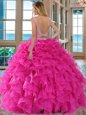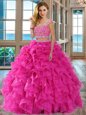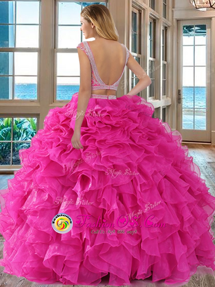 Hot Pink Two Pieces Scoop Cap Sleeves Organza Floor Length Backless Beading and Ruffles Vestidos de Quinceanera