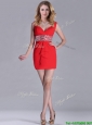 Hot Sale Beaded Decorated Waist V Neck Prom Dress in Red