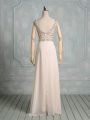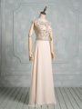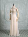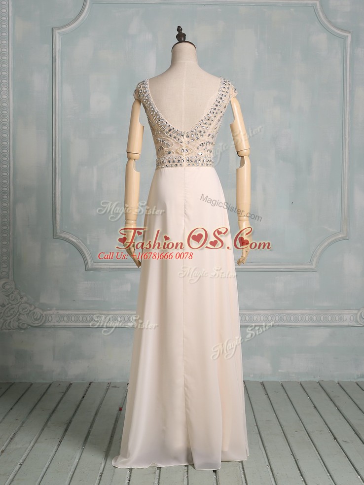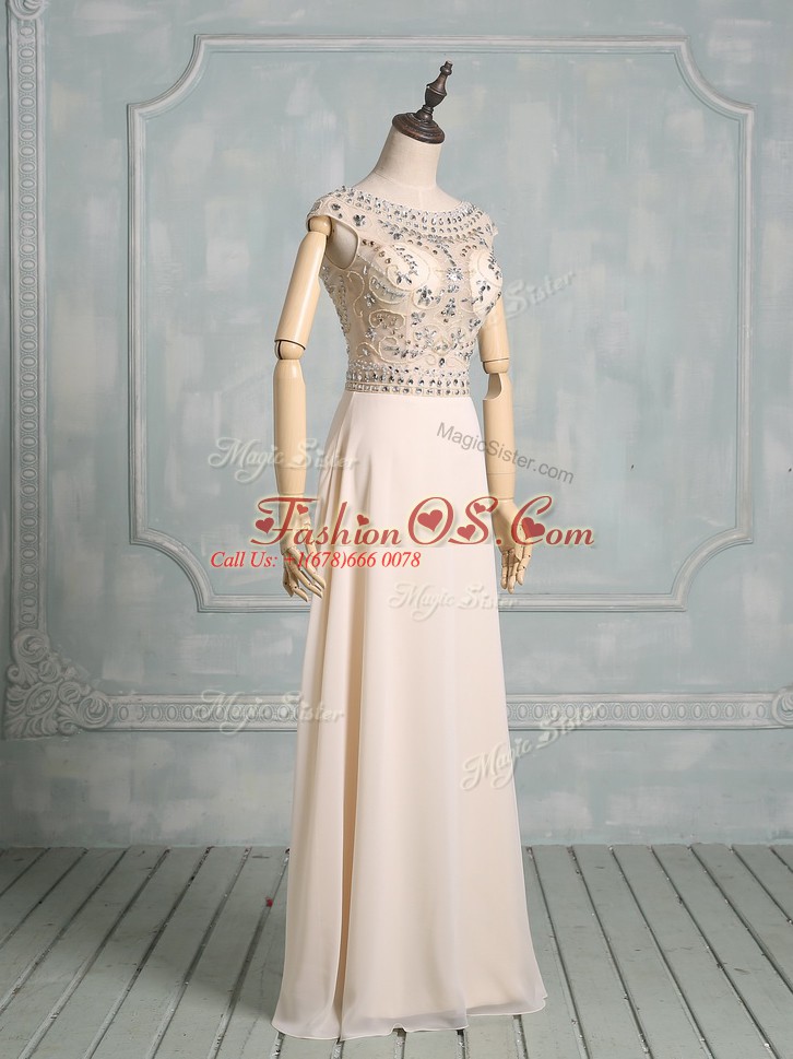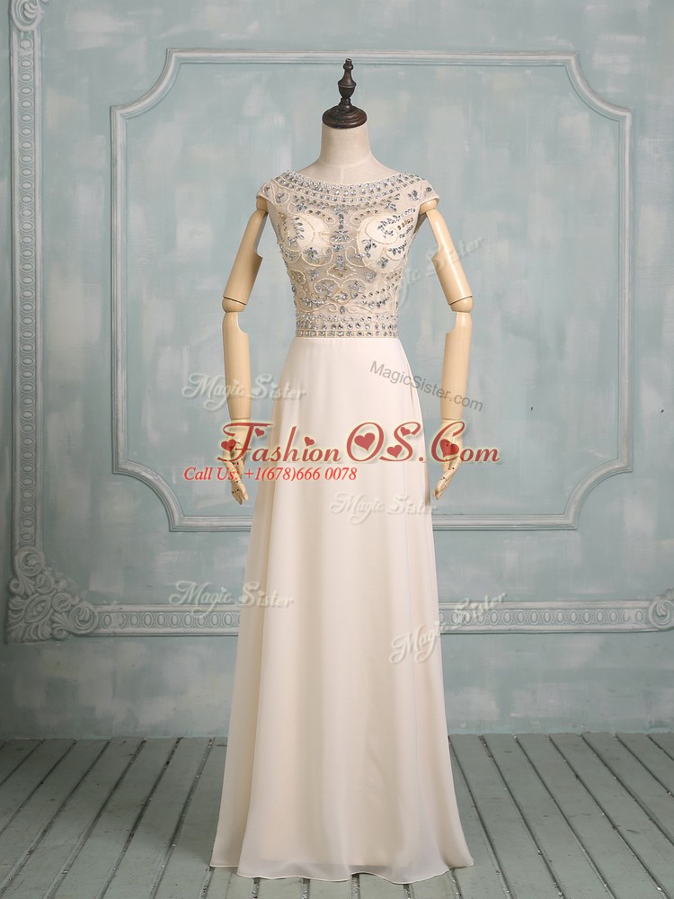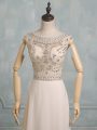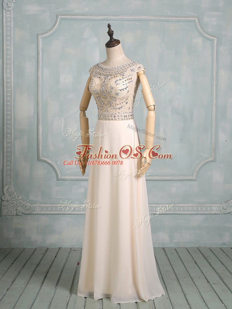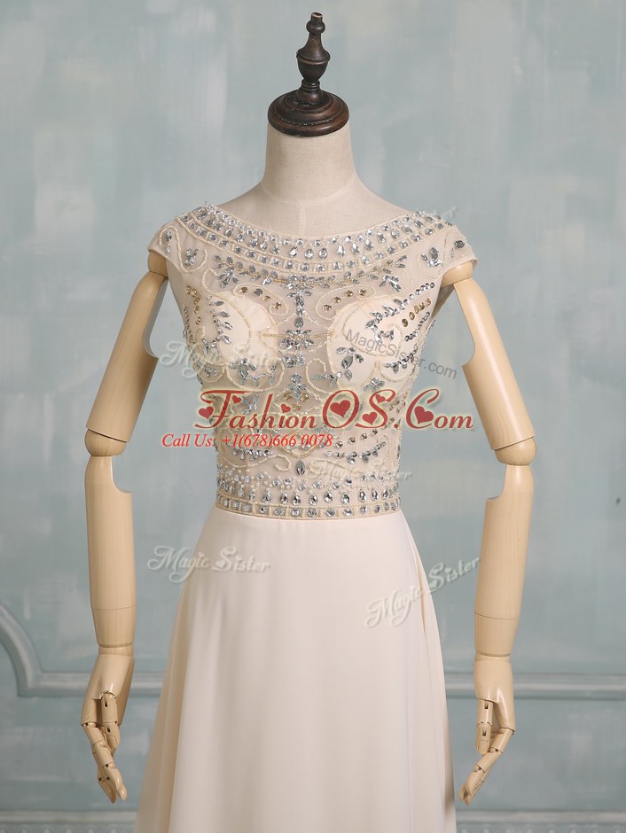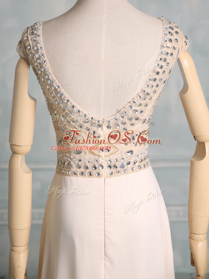 Hot Sale Champagne Empire Beading Prom Evening Gown Backless Chiffon Cap Sleeves Floor Length