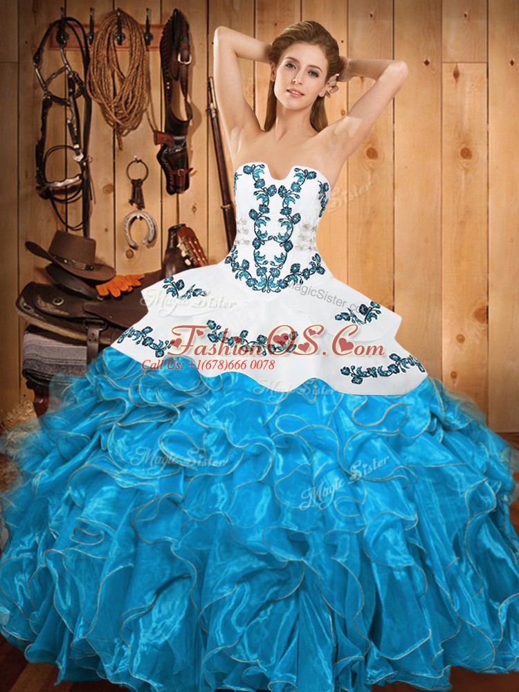 Hot Sale Embroidery and Ruffles Quince Ball Gowns Teal Lace Up Sleeveless Floor Length