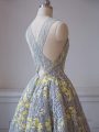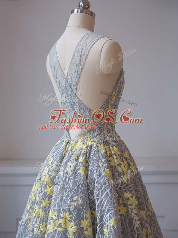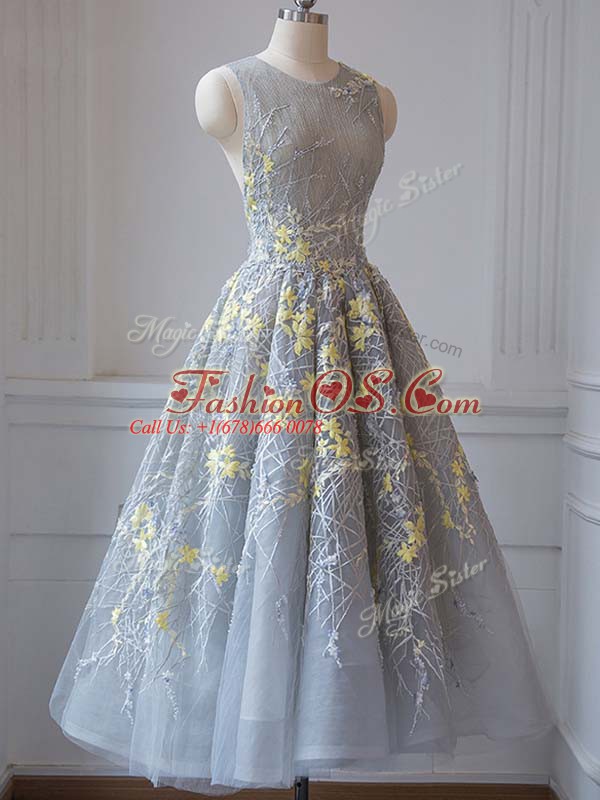 Hot Sale Grey Scoop Neckline Lace and Appliques Prom Dress Sleeveless Criss Cross