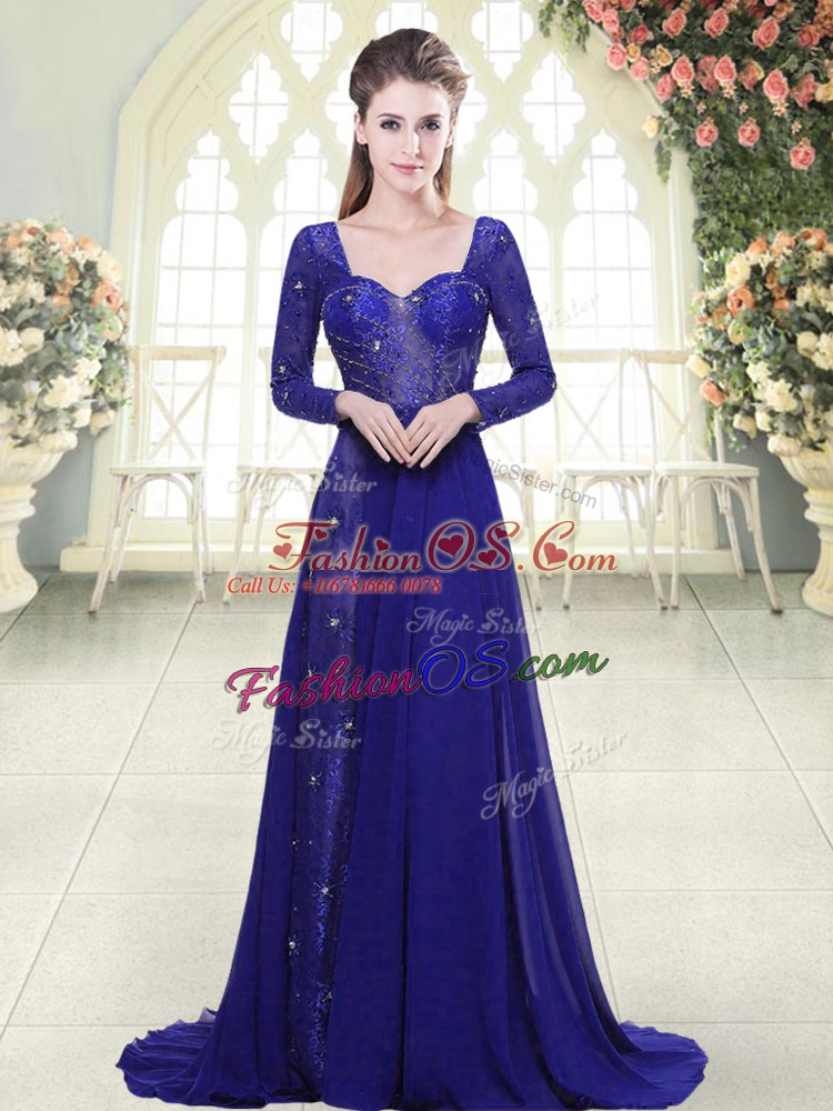 Hot Sale Royal Blue A-line Beading and Lace Party Dress Wholesale Backless Chiffon Long Sleeves