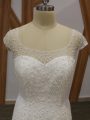 Hot Sale Scoop Cap Sleeves Wedding Gowns Brush Train Beading and Appliques White Tulle