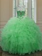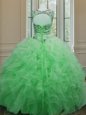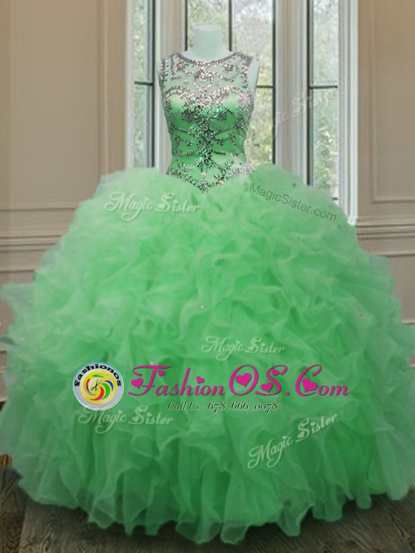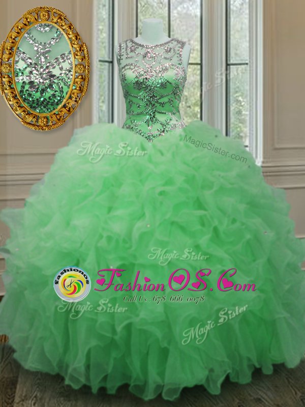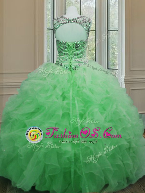 Hot Sale Scoop Sleeveless Floor Length Beading and Ruffles Lace Up 15th Birthday Dress with Green