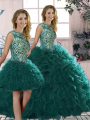 Hot Sale Scoop Sleeveless Sweet 16 Dresses Floor Length Beading and Ruffles Peacock Green Organza