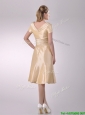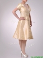 Hot Sale V Neck Champagne Tea Length Mother of the Bride Dress with Short Sleeves
