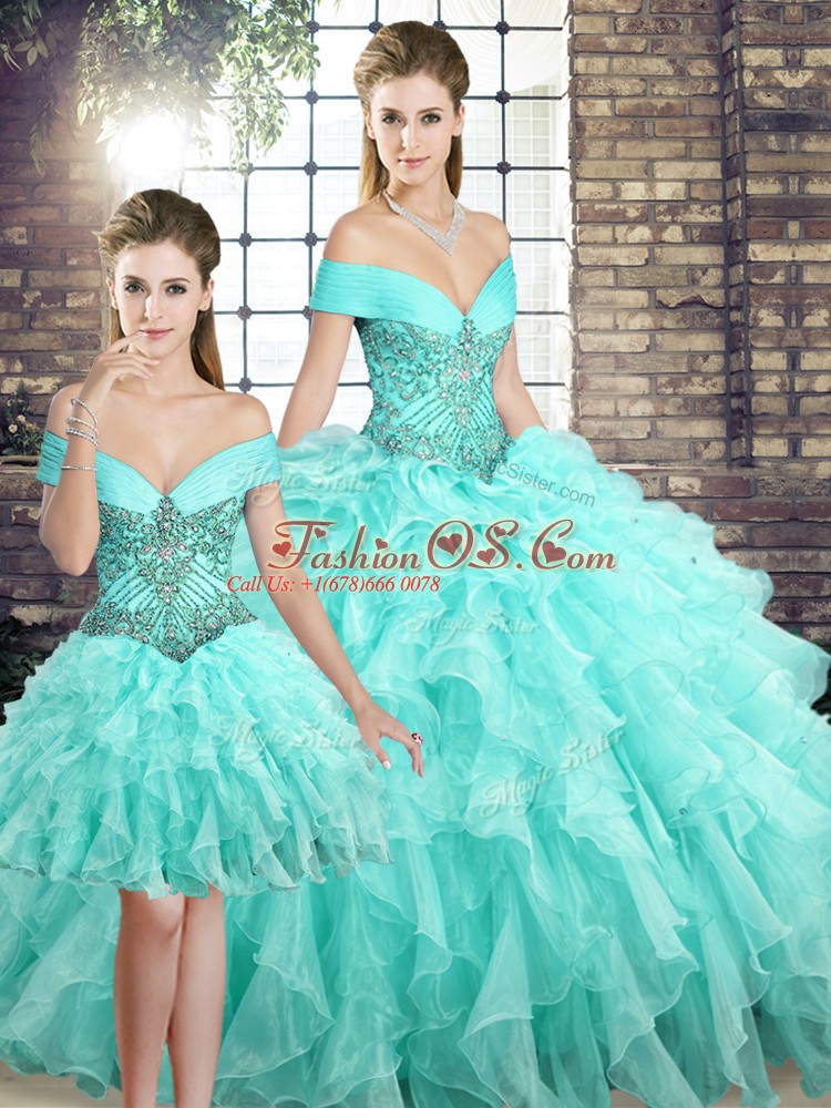 Home >  Quinceanera Dresses >  Detachable Quinceanera Skirts > Hot Selling Aqua Blue Lace Up Off The Shoulder Beading and Ruffles Quinceanera Dress Organza Sleeveless Brush Train