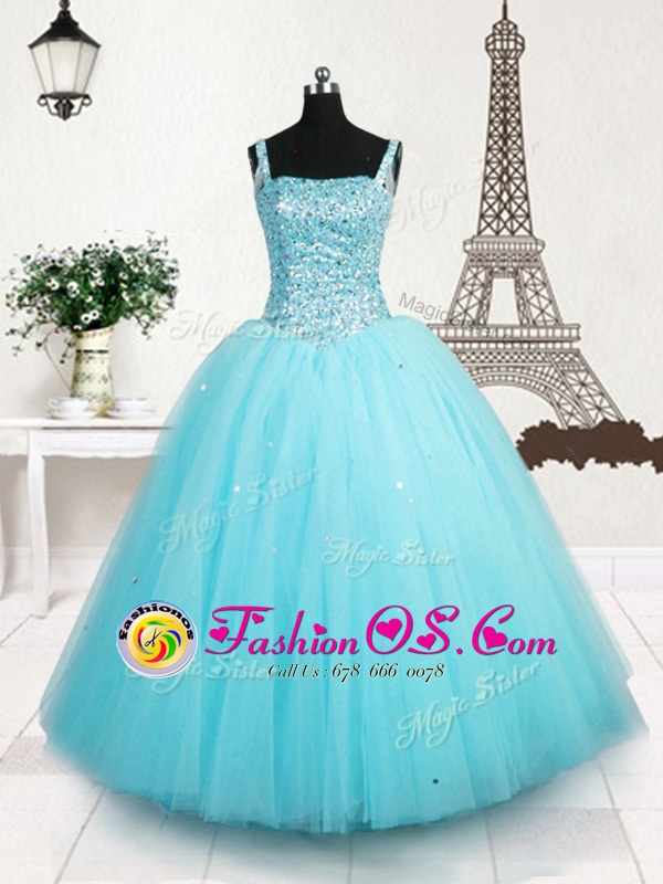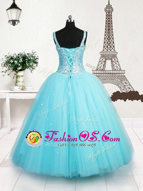 Hot Selling Floor Length Light Blue Kids Formal Wear Tulle Sleeveless Beading and Sequins