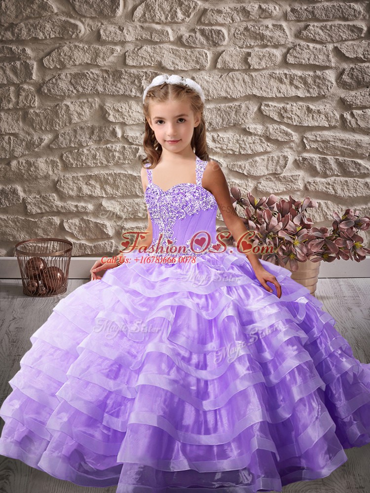 Hot Selling Lavender Kids Formal Wear Organza Brush Train Sleeveless Beading and Ruffled Layers