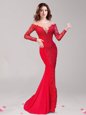 Hot Selling Mermaid Elastic Woven Satin Scoop Long Sleeves Brush Train Clasp Handle Lace Evening Dresses in Red
