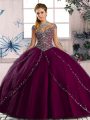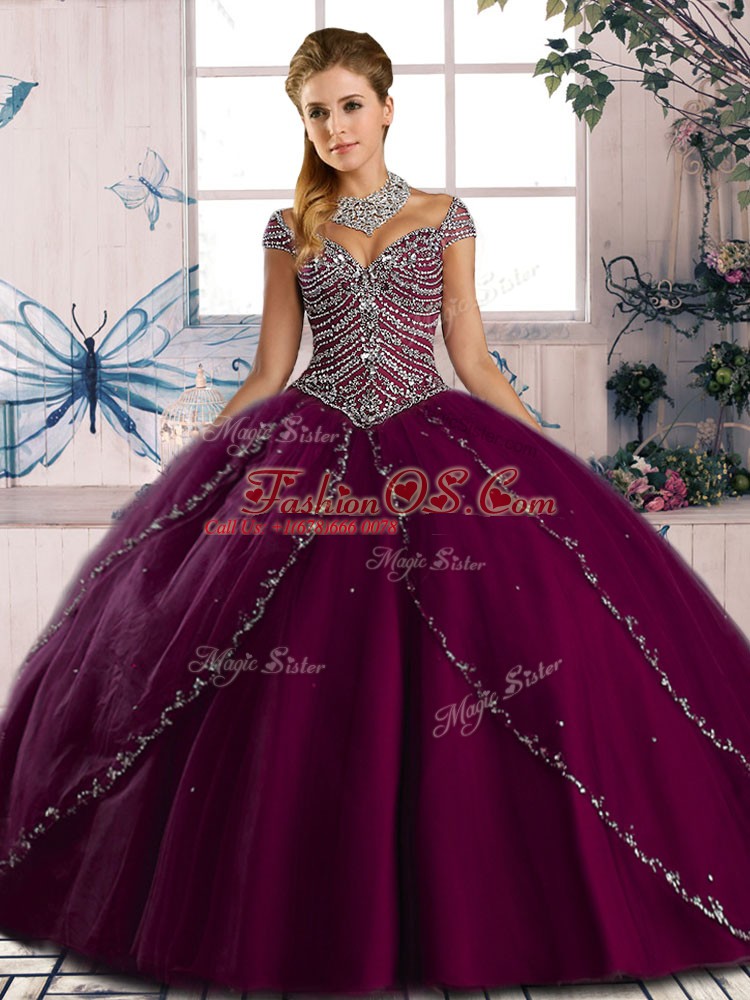 Hot Selling Purple Sweet 16 Dresses Tulle Brush Train Cap Sleeves Beading