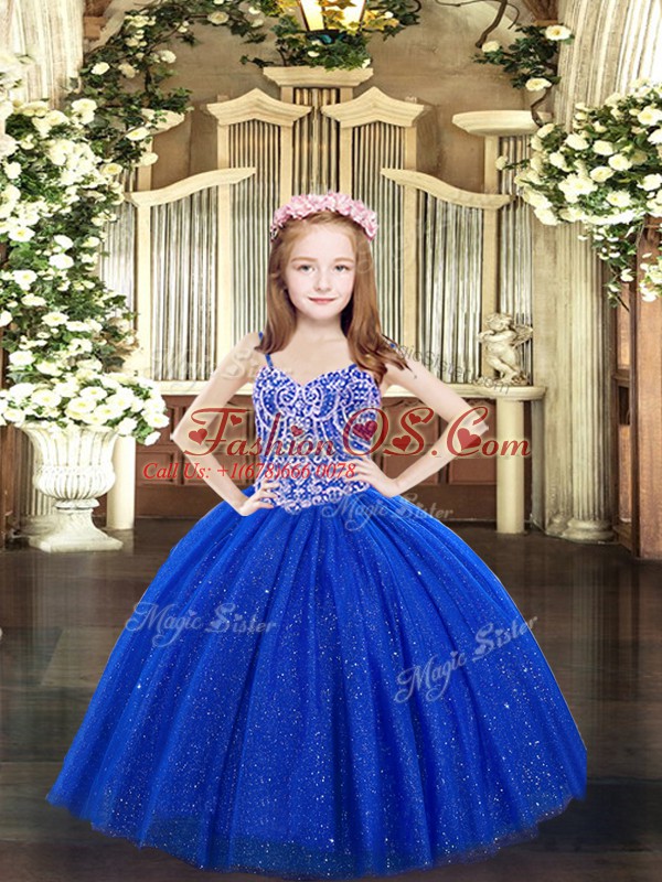 Hot Selling Royal Blue Tulle Lace Up Little Girl Pageant Gowns Sleeveless Floor Length Beading