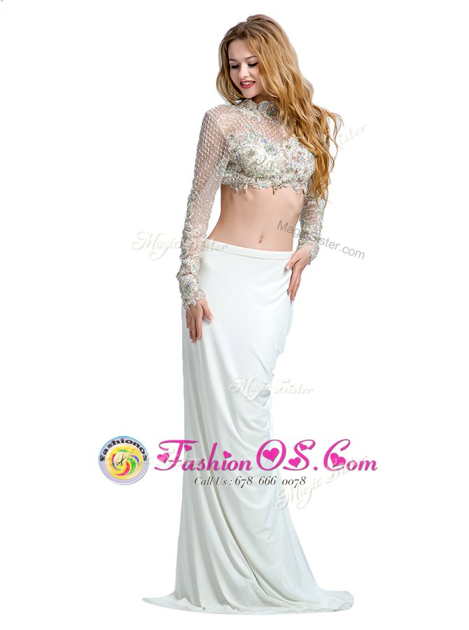 Hot Selling White High-neck Neckline Beading and Lace and Appliques Prom Gown Long Sleeves Backless