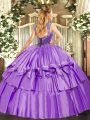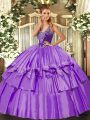 Ideal Floor Length Lavender Quinceanera Dress Organza and Taffeta Sleeveless Beading and Ruffled Layers
