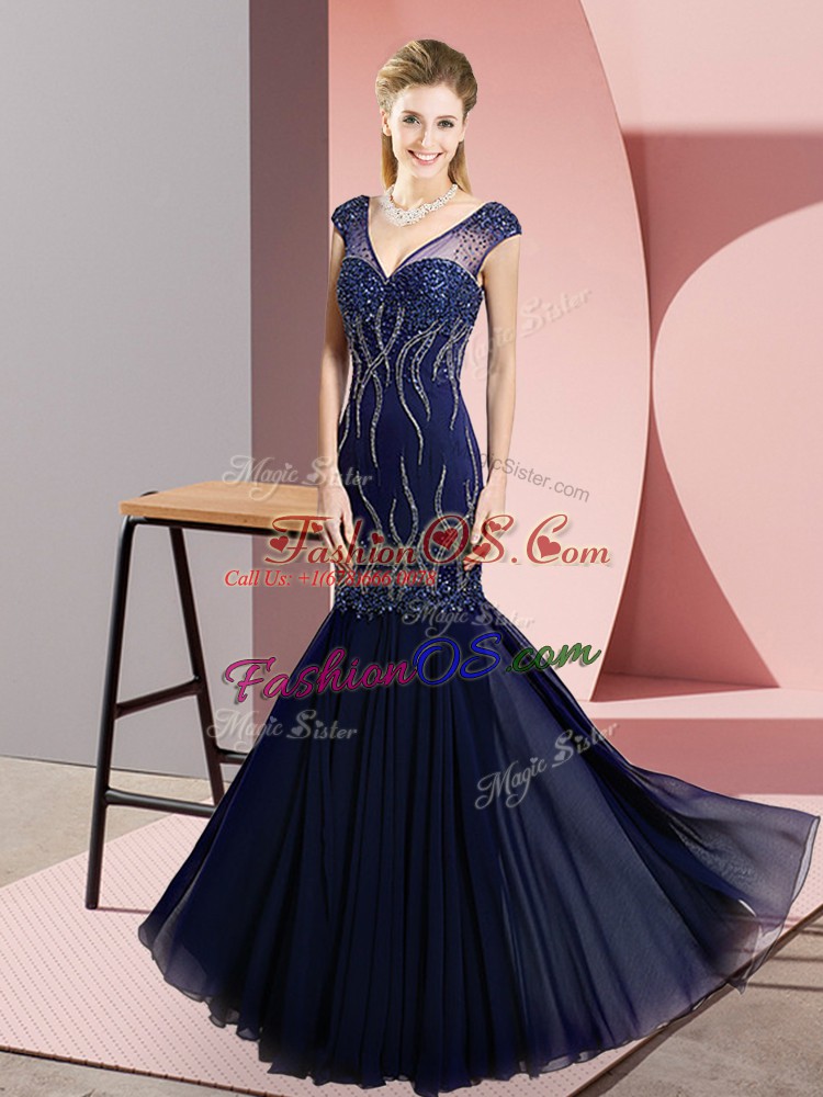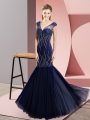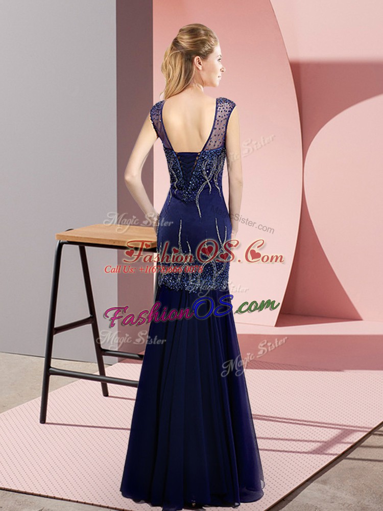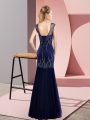 Ideal Floor Length Navy Blue Prom Party Dress V-neck Sleeveless Lace Up