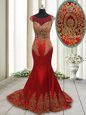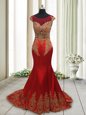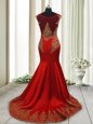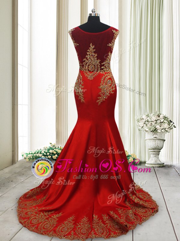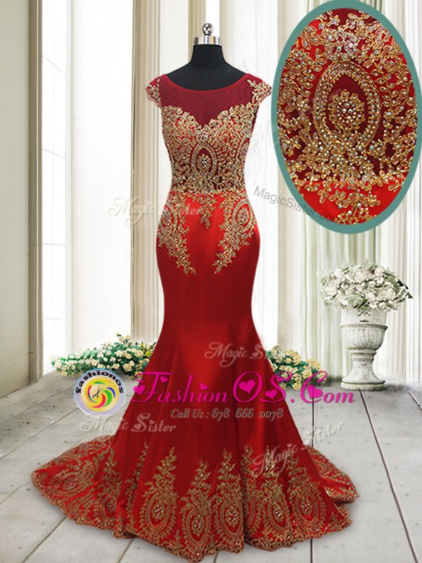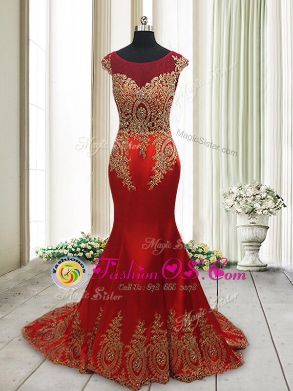 Home >  Prom Dresses >  Perfect Prom Dresses > Ideal Mermaid Wine Red Scoop Side Zipper Appliques Evening Dress Sweep Train Cap Sleeves